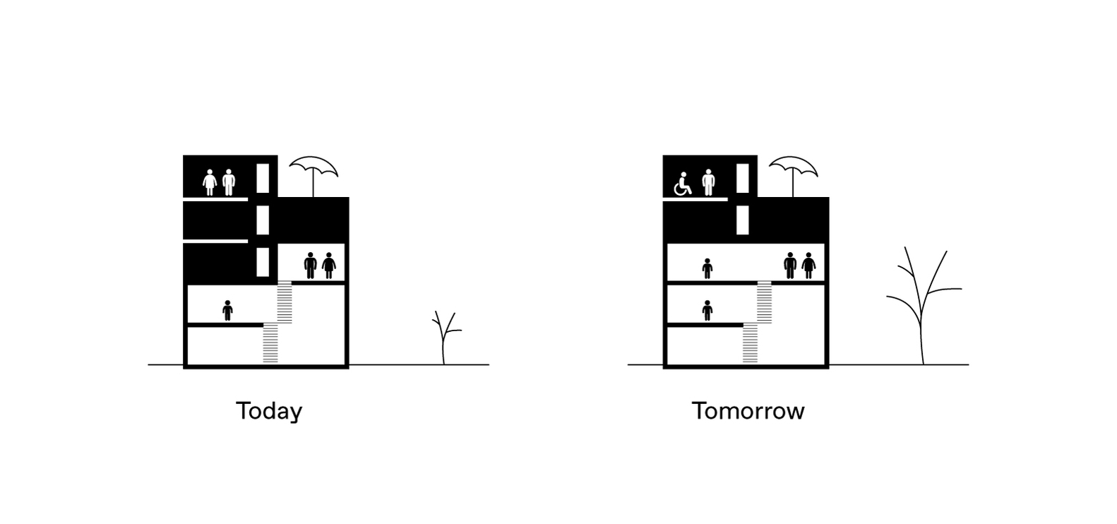This design disguises itself as a traditional single-family home but offers exciting possibilities. Instead of rooms having rigidly defined uses, spaces remain intentionally simple and minimally furnished. This gives every member of the family the power to transform the space as needed. Need a home office one day? A playroom the next? A guest room on the weekend? This flexible design allows the home to evolve along with the family’s changing needs.